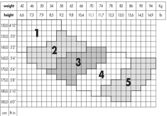 | Peso (kgs.) | 42- 58 | 46 – 66 | 54 – 74 | 66 – 86 | 74 – 94 |