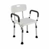 Silla para ducha de aluminio con cuatro patas desmontables y regulables. Ideal para ubicar dentro de la ducha. Fácil de armar. No requiere ningún tipo de herramienta. Material de aluminio y tabla de plástico con agujeros para drenar el agua.